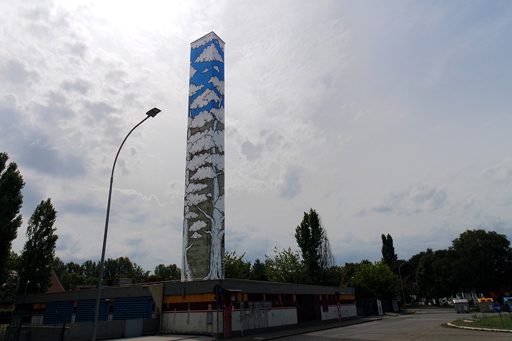 La torre del camino della Centrale Termica di Corticella rappresenta il passaggio degli impianti della centrale a energie eco-sostenibili.